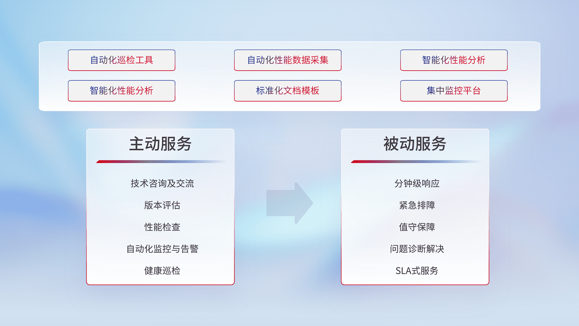 智能化工具和标准化文档,,,保障服务质量,,,提供主动服务(包含技术咨询、、、版本评估、、性能检查、、、自动化监控与告警、、、健康巡检)和被动服务包含(分钟级响应、、、、紧急排障、、值守保障、、、问题诊断解决、、、SLA服务)。。。。