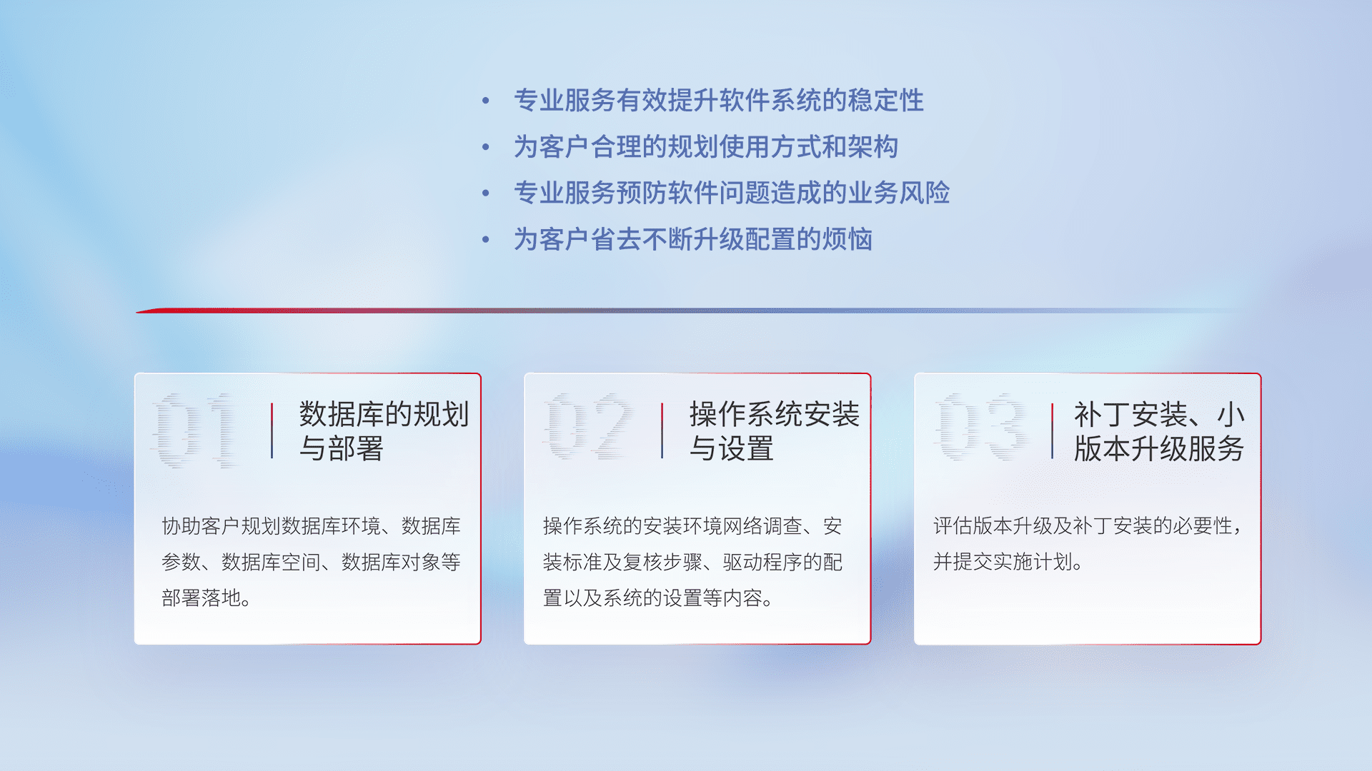 为客户提供软件规模升级、、、、快速部署、、按需配置的专业服务,,,,从数据库的规划与部署到操作系统的安装与设置,,再到补丁安装和小版本升级提供支持。。。。